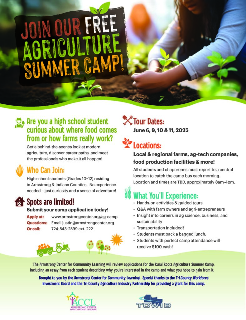 Student applications are due May 16, 2025. The Armstrong Center for Community Learning (ACCL) will review applications for the Rural Roots Agriculture Summer Camp, including an essay from each student describing why you're interested in the camp and what you hope to gain from it.