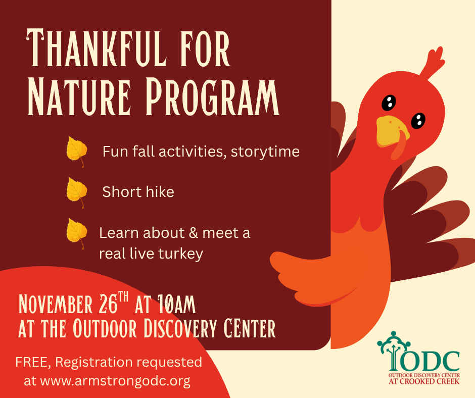 Celebrate the season of gratitude with us. Bring the kids out for some fun, seasonal crafts and activities, take a short hike on one of our trails, and meet a real live turkey. If you can spare, bring a non-perishable food item for donation to a local food bank.